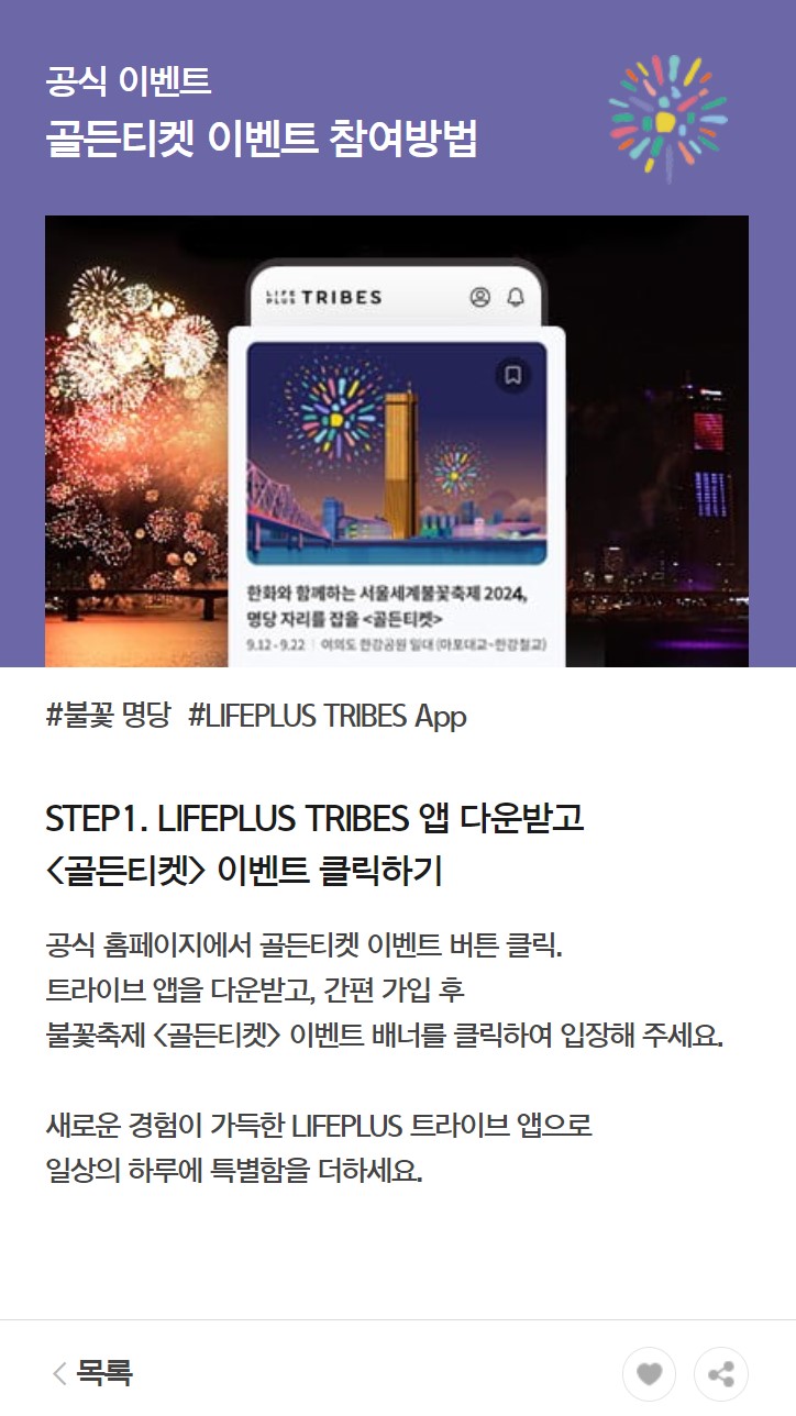 한화에서 주최하는 2024 여의도 불꽃축제 골든티켓 이벤트에 참여하면 여의도 한강공원 불꽃축제 바로 앞 메인 무대에서 불꽃놀이를 관람할 수 있습니다.